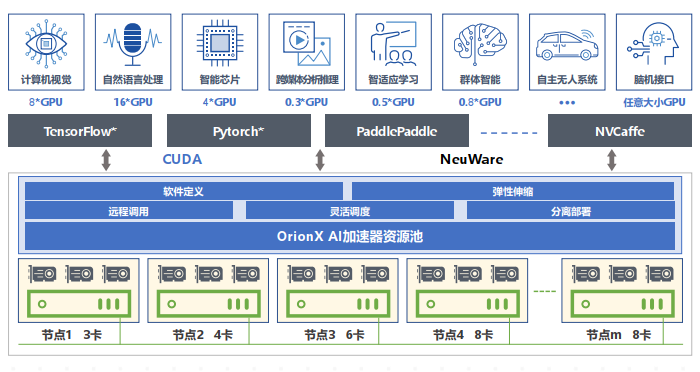 OrionX 帮助客户构建数据中心级 AI 算力资源池, 使用户应用无需修改就能透明地共享和使用数据中心内任何服务器之上的 AI 加速器。 OrionX 不但能够帮助用户提高 AI 算力资源利用率, 而且可以极大便利用户 AI 应用的部署。