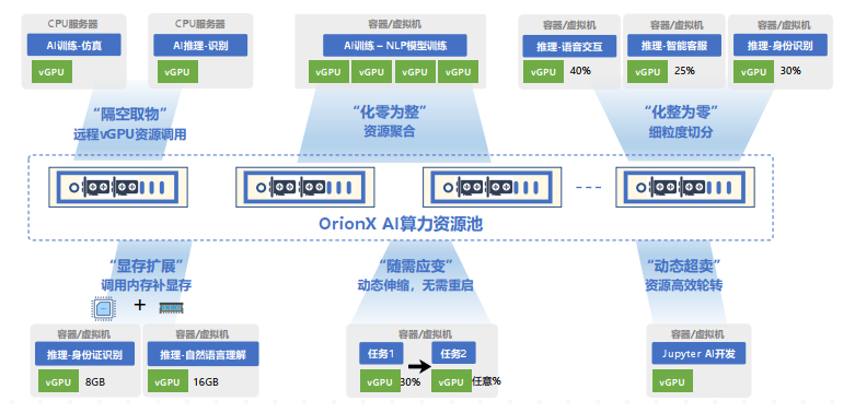 OrionX 通过软件定义AI算力,颠覆了原有的AI应用直接调用物理GPU的架构,增加软件层,将AI应用与物理GPU解耦合。AI应用调用逻辑的vGPU,再由OrionX将vGPU需求匹配到具体的物理GPU。OrionX 架构实现了GPU资源池化,让用户高效、智能、灵活地使用GPU资源,达到了降本增效的目的。