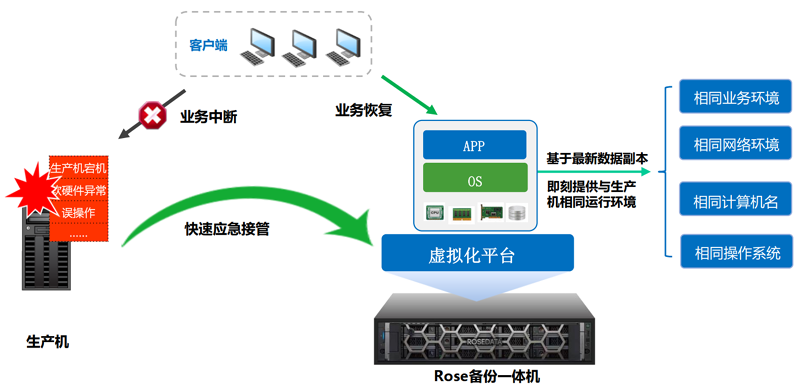 当生产机因软硬件故障、误操作、中病毒等故障,可在容灾管理平台快速启动一个应急虚拟机实例,代替原生产主机恢复业务运行,保障业务不中断。