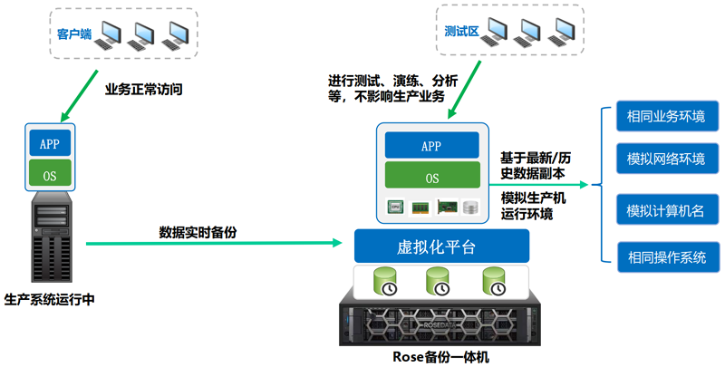 选择所需的数据副本,在一体机内启动演练虚拟机实例,可用于容灾演练、备份恢复测试、数据验证、开发测试、数据抽取等场景,提升备份数据的利用价值。演练测试时,对生产机无任何影响,无需停止关闭生产机业务系统。