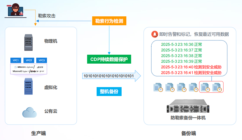 为生产系统提供勒索病毒行为感知模块,在生产系统被勒索病毒入侵后,能及时对备份数据进行质疑标记,同时发送邮件通知,有效区分健康数据和疑似感染数据,帮助用户轻松轻微可用的恢复数据。