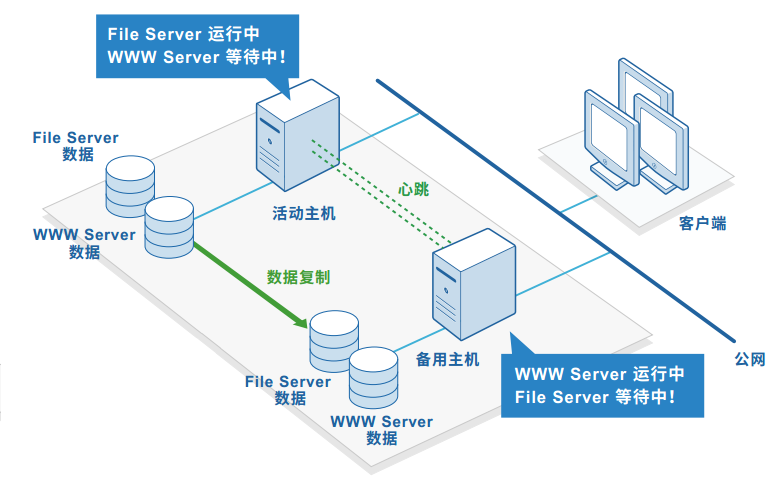 两台服务器即可构建镜像集群方案,对服务器硬件配置要求不高,可以根据环境情况采用不同型号、不同配置的服务器,节省硬件投入。支持物理机、虚拟机的运行环境,灵活的部署方式,轻松构建P-P,V-V,P-V,V-P部署模式,更为广泛的适用于物理机、虚拟机的运行环境。