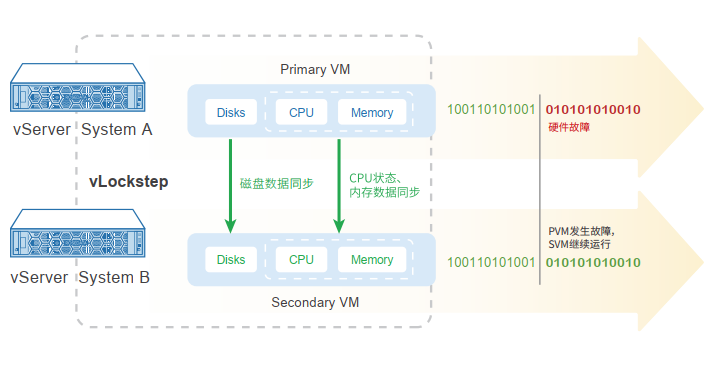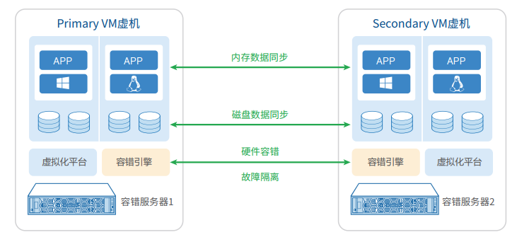 在同一时刻,两个物理节点之上的虚拟机完全一致, 实现了对虚拟机操作系统的硬件故障隔离,用户可以像使用单机一样使用,实现了透明转移、零秒切换。当任何部件发生故障时,自动隔离故障单元,应用程序在用户没有察觉的情况下继续执行,实现业务系统零中断。