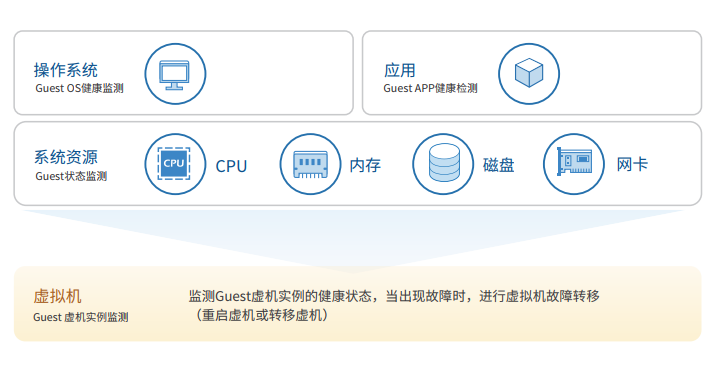 公司结合在业务连续性市场积累的三十年软件故障场景判断经验和市场需求,在自研的Rose vServer容错系统中,开创性地增加了软件层面监控与保护(HA Agent)。当检测到业务系统、操作系统、虚拟机的软件逻辑故障时,通过重启应用程序、重启虚拟机等方式,自动恢复业务系统地运行,最大程度地保障了业务系统的高可用性。
