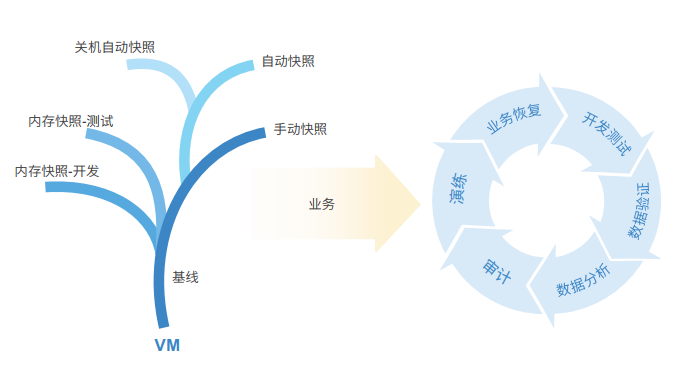 通过计划/手动快照对虚拟机进行数据层面保护,可应对勒索病毒、人为误操作带来的数据丢失风险。在不影响业务运行的情况下,也可通过快照副本用于演练、数据验证、开发测试、升级验证等工作。