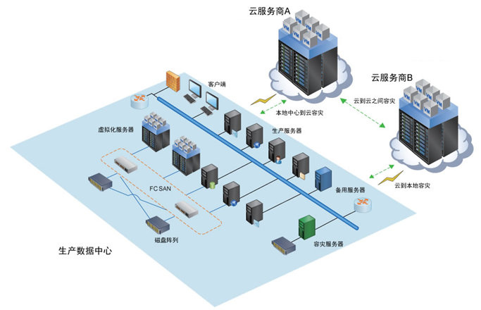 在云端的主机之间做高可用。在按需分配的基础上,通过云端与云端的灾备,既可大大节省建立多个专有灾备中心的费用,如相关的硬件、软件、电力、冷却以及管理等的费用,又可享受海量存储和高性能云计算的服务。支持不同的云。