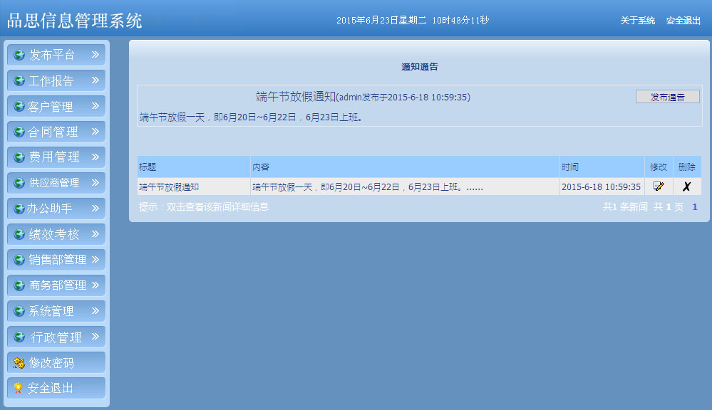里面的功能根据用户部门不同而不同,系统自动显示改功能,譬如销售部用户进去后,会显示:发布平台,工作报告,客户管理,费用管理,办公助手;技术部用户进去后,会显示:发布平台,工作报告,费用管理,办公助手。