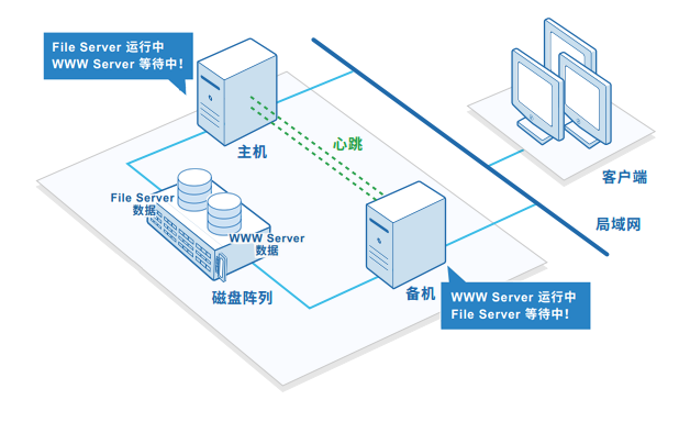 也叫主从模式、单工模式,主机工作,备机处于监控准备状态。当主机宕机时,备机立刻自动接管主机的应用,待主机恢复正常后,应用以自动或手动的方式切换回主机上运行。