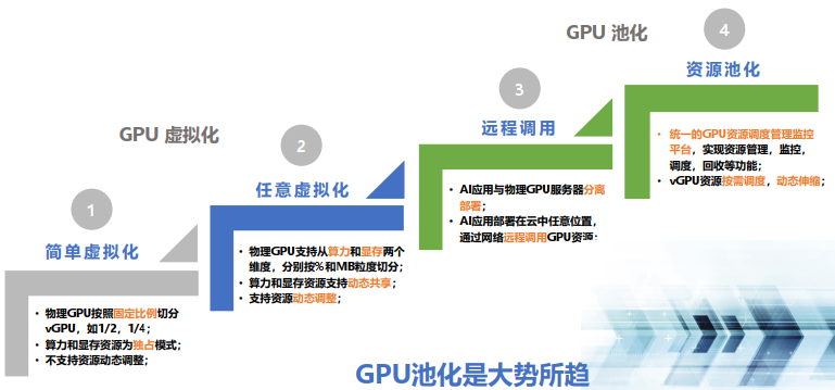 GPU资源池化技术从初期的简单虚拟化,到资源池化,经历了四个技术演进阶段:
