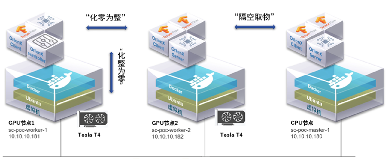 支持将虚拟机或者容器运行在一台没有物理GPU的服务器上,通过计算机网络,透明地使用其他服务器上的GPU资源,该虚拟机或者容器内的 AI 应用无需修改代码。通过这个功能,OrionX 帮助用户实现了数据中心级的 GPU 资源池,实现了AI应用和GPU物理资源的解耦合,AI 应用在一个不满足训练条件的纯CUP服务器上,也一样能够快速调集多个GPU卡完成训练任务。