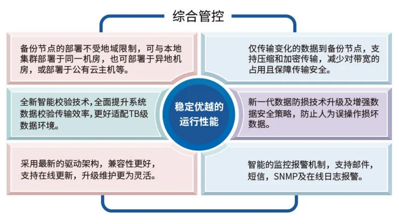 实时监控软硬件运行状态,智能完成本地热备集群的主备切换,保障业务连续运营。优化切换效率,智能校验支持TB级数据量环境,提供远程Web管理,简化运维。