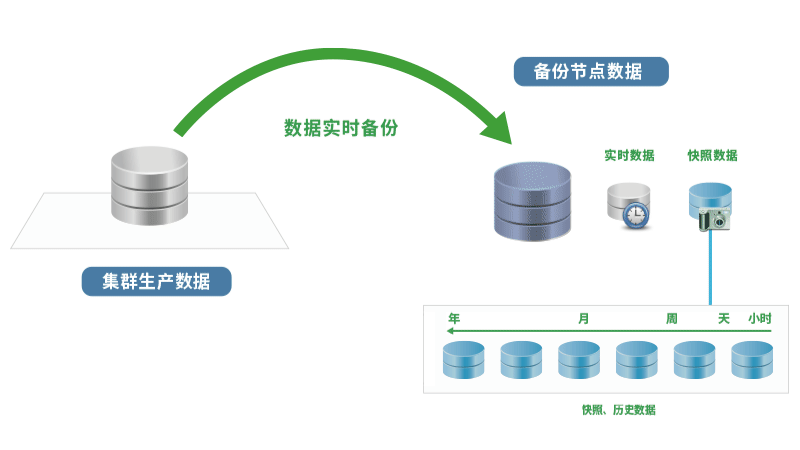 •实时捕获高可用集群中的生产数据写入,通过TCP/IP网络复制数据至备份节点,在备份节点上存储一份实时数据副本和快照数据。