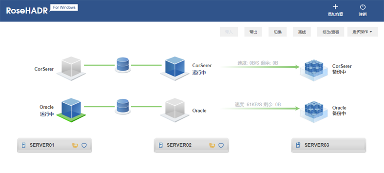 •Rose通过实时监控系统资源的运行状态,当发生硬件故障、应用软件异常、操作系统宕机、人为误操作时,将自动切换到备机运行,实现企业关键业务7x24小时不间断运营。