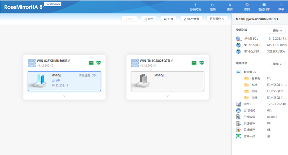 增强数据安全策略: 提供全面的数据安全策略,对数据的可用状态进行监控,充分保证切换后的数据状态是一致有效的。RoseMirrorHA完整的高可用性保护策略,在主机发生故障时,可以及时自动的将应用服务切换到备机,确保业务的迅速恢复。